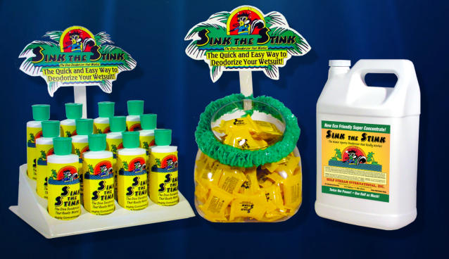 Sink the Stink® is a natural, environmentally friendly, state of the art product, specifically formulated for the diving, surfing and water sports community. Sink the Stink® biologically eliminates the odors commonly found in neoprene wet suits, BCDs and dive skins, including urine, mildew and other gnarly smells that can knock the Oakleys right off your face.